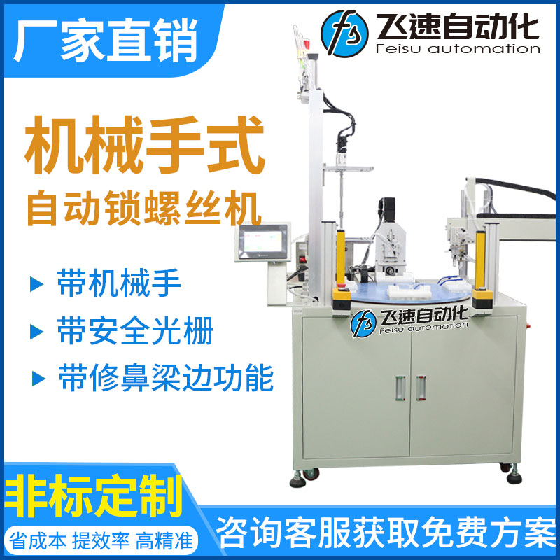 轉(zhuǎn)盤(pán)機(jī)械手式擰螺絲機(jī)優(yōu)點(diǎn): 省人工,流水線專用,配置機(jī)械手和轉(zhuǎn)盤(pán),實(shí)現(xiàn)供料、檢測(cè)、鎖付、取放產(chǎn)品同步作業(yè),并由設(shè)備自動(dòng)完成,節(jié)省大量人工;