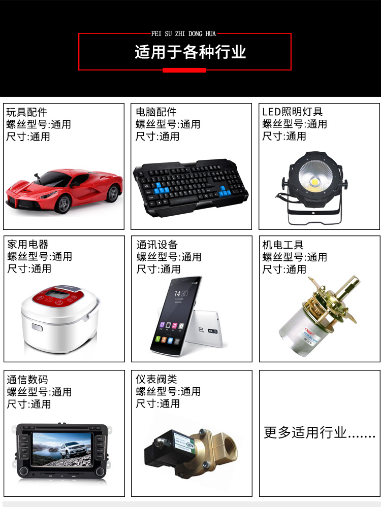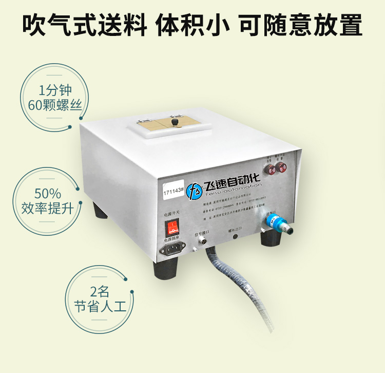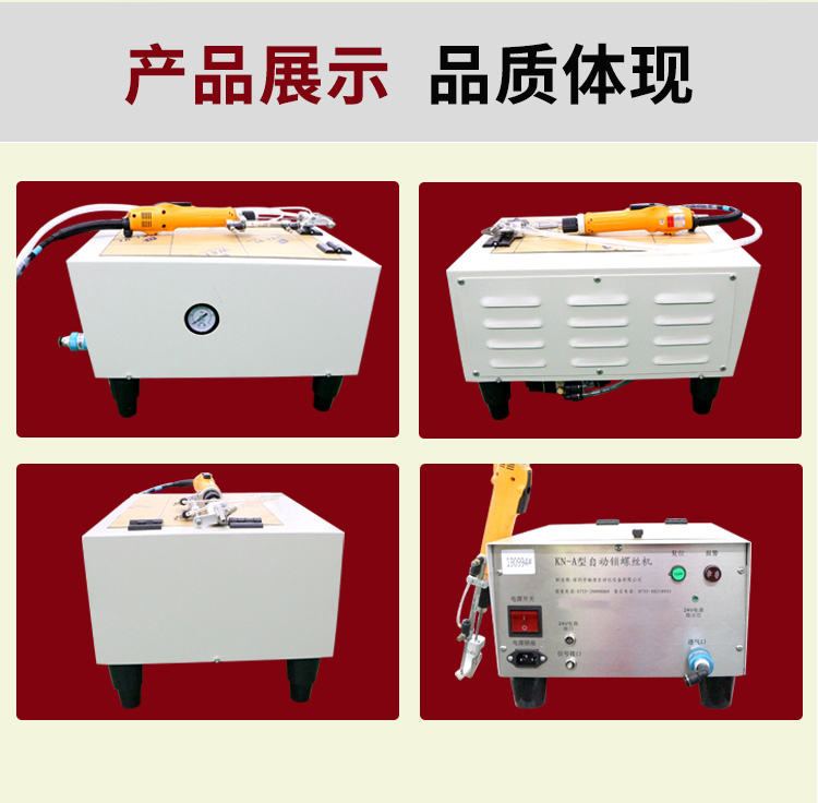 - 產(chǎn)品簡介: 手持式自動打螺絲機也叫自動供料鎖螺絲機、自動擰螺絲機等,嚴(yán)格來講,手持式只能算是半自動,因為它還是需要手工操作。一臺手持式自動鎖螺絲機主要由兩部分組成:自動供料機和電批,其中自動供料機是重要的,也是復(fù)雜的,它的好壞直接關(guān)系到機器卡不卡料的問題。1.采用渦輪上料,體積和噪音小、重量輕,可存放在工作平臺上,節(jié)省空間; 飛速手持式螺絲機: 1.螺絲自動排列、供料,自動篩選異型螺絲,自動補給空料,無料會自動報警; 2.送料采用感應(yīng)器控制,鎖付完一顆來一顆,自動送料,不會出現(xiàn)重復(fù)給料現(xiàn)象; 3.滑牙不送料:在鎖付工程中,扭力達不到,螺絲不送出,防止批嘴出現(xiàn)卡料現(xiàn)象; 4.穩(wěn)定性好,不卡料,即使不良導(dǎo)致卡料,非專業(yè)人員也可以在幾秒鐘內(nèi)解決卡料; 5.效率高,一般1秒鐘打一個螺絲,不用抓起螺絲,只需對準(zhǔn)螺絲孔位鎖緊螺絲即可; 6.可減少1到2個工人螺絲鎖付作業(yè),實現(xiàn)半自動化生產(chǎn),降低工人的勞動強度,提高生產(chǎn)率; 7.關(guān)鍵部位采用高品質(zhì)五金材料并經(jīng)過特殊處理,電子原器件采用原裝進口,確保設(shè)備零故障。 產(chǎn)品適用范圍 1.適用于各種類型的螺絲,螺絲總長應(yīng)大于1.3倍螺帽直徑; 2.支持深孔螺絲鎖付,孔深小于40mm,M1-M6的螺絲; 3.適用于數(shù)碼、電子、小家電、電源開關(guān)、燈具、LED、玩具等產(chǎn)品。